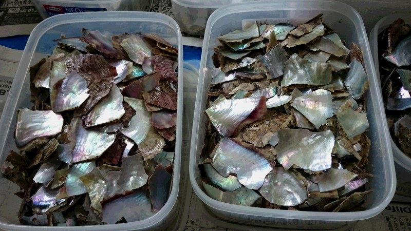 本当は アコヤ貝を手に取って見て貰ってから お友達に砕いて貰ってプレート作りをしてもらうといいのですが……。(^^;時間と少々危険なので 下準備です。。。後もうちょっと、頑張るぞ〜(^3^)/