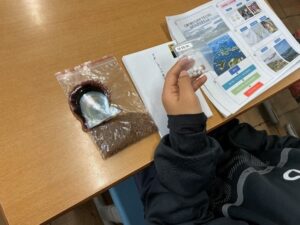 少しでも真珠養殖やSDG’Sが身近に感じてもらえるよう、紙芝居や写真や実物を見て,触ってもらいました。